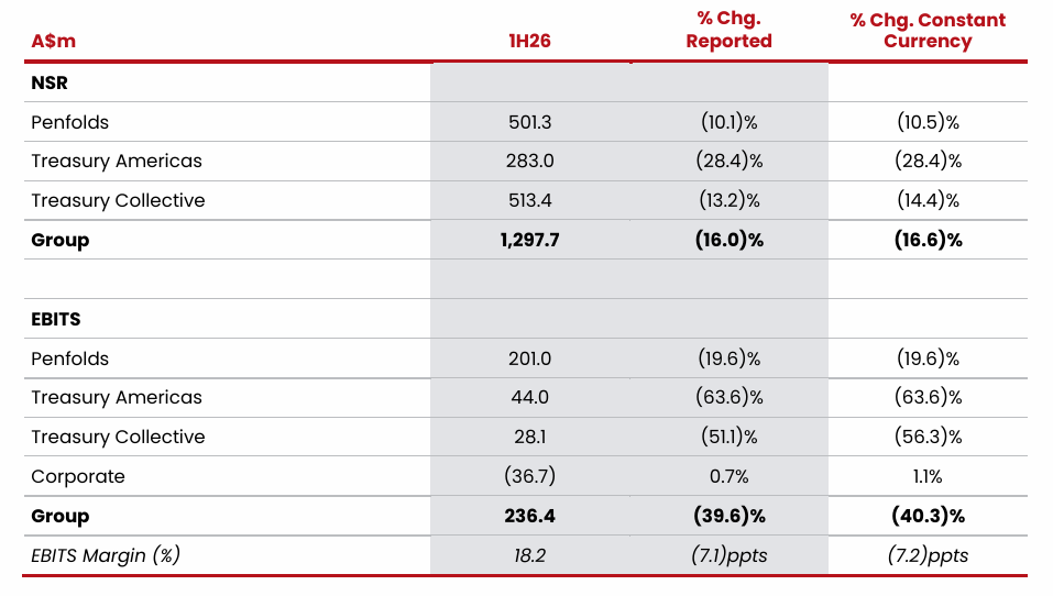 AI导读: 富邑葡萄酒集团2026财年上半年业绩报告显示,集团整体净销售收入出现下滑,主要受美国及中国葡萄酒品类趋势走弱、为遏制平行进口主动限制对亚洲(除中国外)及澳大利亚的出货,以及上一财年中国关税取消后渠道搭建形成的高基数等因素影响。具体而言,奔富事业部录得5.01亿澳元,同比下滑10.1%;富邑美洲事业部录得2.83亿澳元,同比下滑28.4%;富邑精选事业部录得5.13亿澳元,同比下滑13.2%。尽管销售收入下滑,集团息税前利润(EBITS)为2.364亿澳元,略高于业绩指引区间。然而,集团法定净利润(NPAT)录得亏损6.494亿澳元,主要由于对美国资产进行了非现金减值,产生了7.51亿澳元的税后重大项目亏损。扣除重大项目及特殊资产重估影响后,归母净利润为1.285亿澳元,同比下滑46.3%。作为集团旗舰品牌,奔富事业部在核心中国市场表现强劲,动销额同比增长17.2%,澳大利亚本土增长3.5%,核心大单品Bin 389和Bin 407动销同比增长11.3%。其净销售收入下滑主要归因于去年同期的高基数以及为遏制平行进口而主动减少亚洲(除中国外)及澳大利亚市场的出货量。集团已采取一系列战略举措应对市场挑战,包括启动专项降库存计划,目标在未来两年内将中国市场库存降低约40万箱,并将加州以外地区分销商库存降低30万箱。同时,集团转型项目“富邑锐进计划”顺利推进,旨在优化品牌组合、升级运营模式及管控成本,目标在未来2-3年内实现每年1亿澳元的成本优化。集团预计2026财年下半年息税前利润将高于上半年,主要得益于加州分销渠道转型完成后当地业务发展势头的改善。首席执行官山姆·费舍尔强调,公司核心品牌终端表现持续向好,消费者认可度稳步提升,为推进业务转型和实现可持续盈利增长奠定了坚实基础。