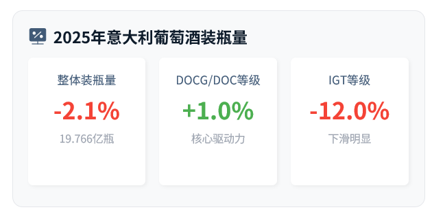 AI导读: 意大利葡萄酒认证监管机构Valoritalia发布的报告显示,2025年意大利葡萄酒装瓶量呈现结构性变化。从等级看,保证法定产区(DOCG)和法定产区(DOC)葡萄酒装瓶量同比增长1%,保持稳定增长;而原产地保护产区(IGT)葡萄酒装瓶量则大幅下滑12%。从品类看,市场消费偏好变化显著:桃红葡萄酒装瓶量增长5.7%,静止白葡萄酒增长2.7%,起泡酒增长1%;与之形成鲜明对比的是,静止红葡萄酒装瓶量锐减13%,反映出红葡萄酒消费市场的显著萎缩。